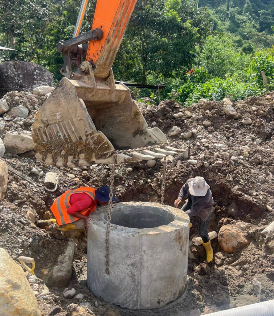 Según Juan Guamán, administrador del contrato, entre los trabajos ejecutados hasta la fecha, constan: el replanteo y nivelación del terreno, excavaciones y rellenos, instalación de 1.3 Km de tubería PVC corrugada de 110 mm y 200 mm, colocación de cajas y pozos de revisión de alcantarillado sanitario, así como la reparación de la estructura existente del sistema de agua potable. Actualmente se avanza en la construcción de la planta de tratamiento de aguas residuales, componente esencial para garantizar un adecuado manejo ambiental y sanitario.